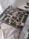 Je présente des tables basses, se déclinant sous différentes dimensions, adaptées à des intérieurs personnalisés. J'émaille des carreaux biscuités que j' utilise entiers ou coupés, au gré de mon imagination, et je n’hésite pas les mélanges pierre - céramique ou verre - céramique, afin de varier les effets.